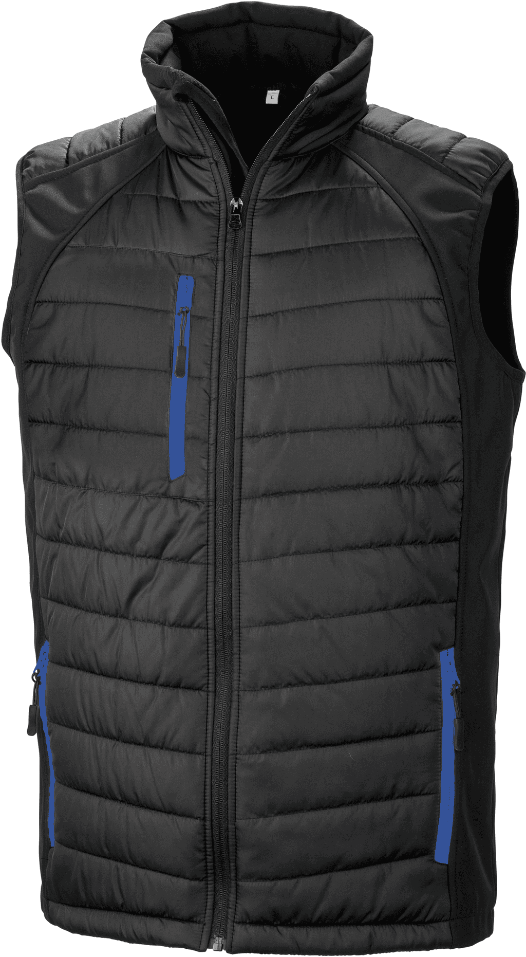 Black compass gewatteerde softshell bodywarmer – Stof lichaam: Buitenkant: 100% JIAREN gerecycled Polyester. Isolatie: 180 g/m² polyester. Voering: 100% polyester. Ritssluiting met gewatteerde kinbescherming op de voorkant. Ritszakken in een contrasterende kleur, één op de borst en twee opzij, met zwarte schuivers. Gewatteerd lichaam. Heel zacht, licht en warm. Verborgen drukkersrits op de borst links. – Licht en warm tegelijk, aangenaam om te dragen. – Winddicht en waterdicht. – Afneembaar etiket, gemakkelijk opnieuw te plaatsen.
