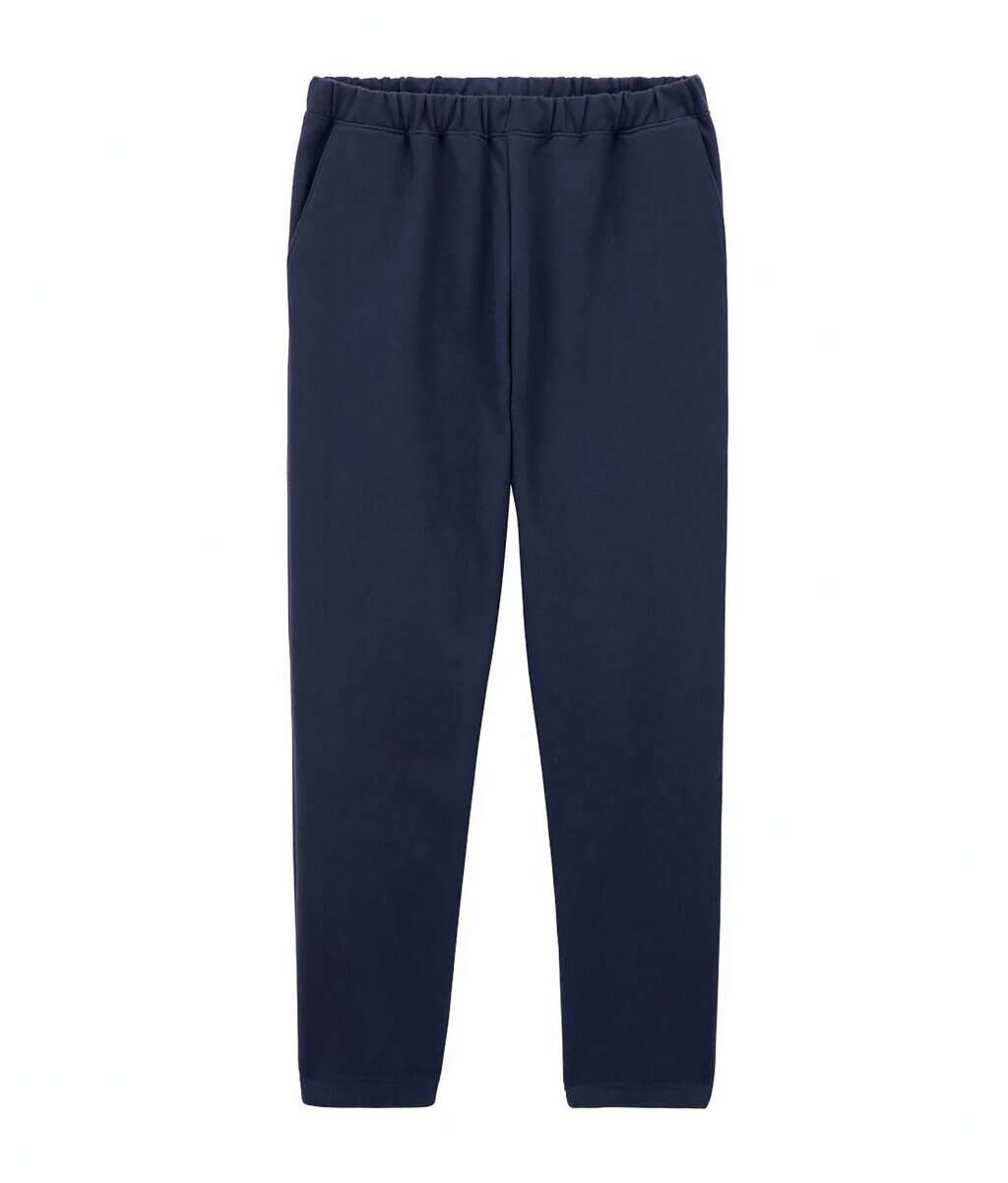 80% ringgesponnen katoen / 20% polyester. Elastische tailleband met bijpassende platte interne koorden. Schuine steekzakken. Klassieke pasvorm met taps toelopende pijpen en elastische manchetten.