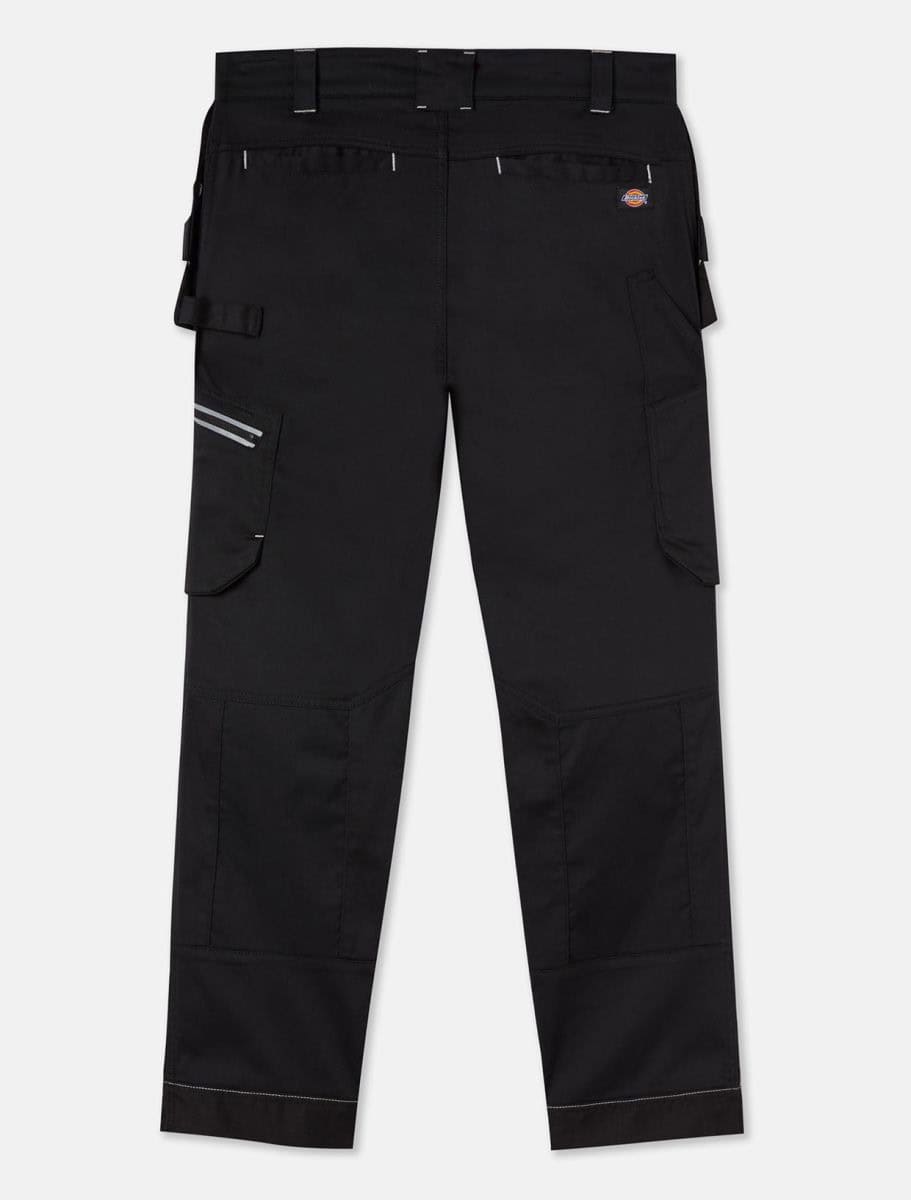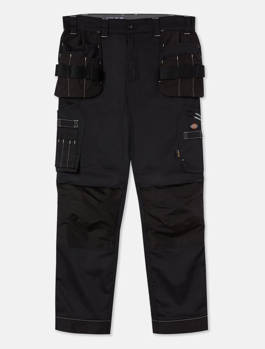 Universele herenbroek FLEX (TR2010R) – 60% katoen / 38% polyester / 2% elasthan. Verschillende zakken. Holsterzakken. Knieversteviging. Elastische tailleband. Lus voor een hamer. Zak voor een meter. Reflecterende stroken. – Verschillende zakken: heel handig en functioneel. – Aanpasbare taille, blijft heel goed zitten. – Genaaid label met het logo van Dickies erop.
