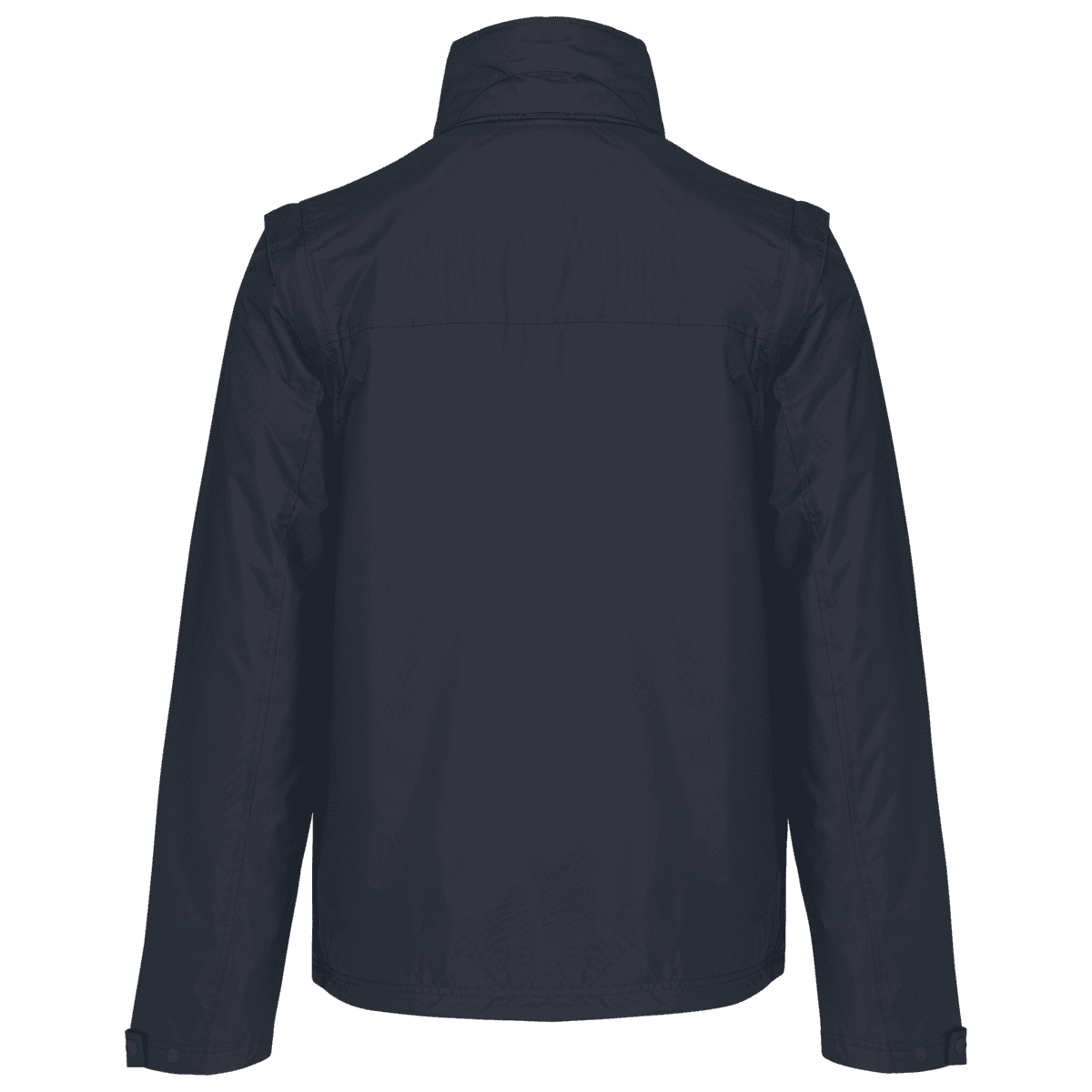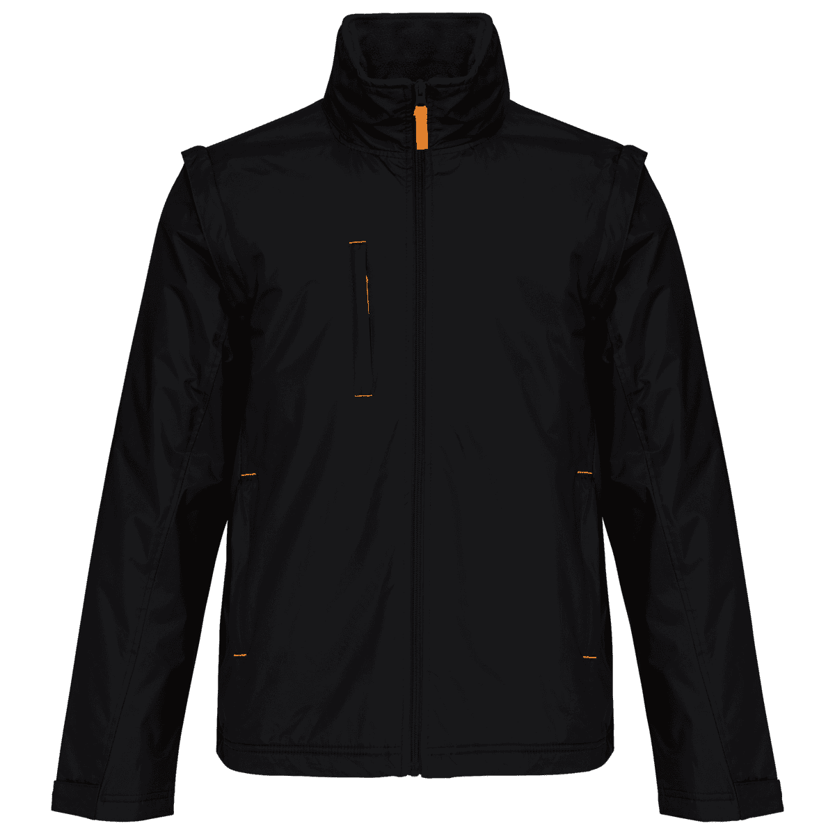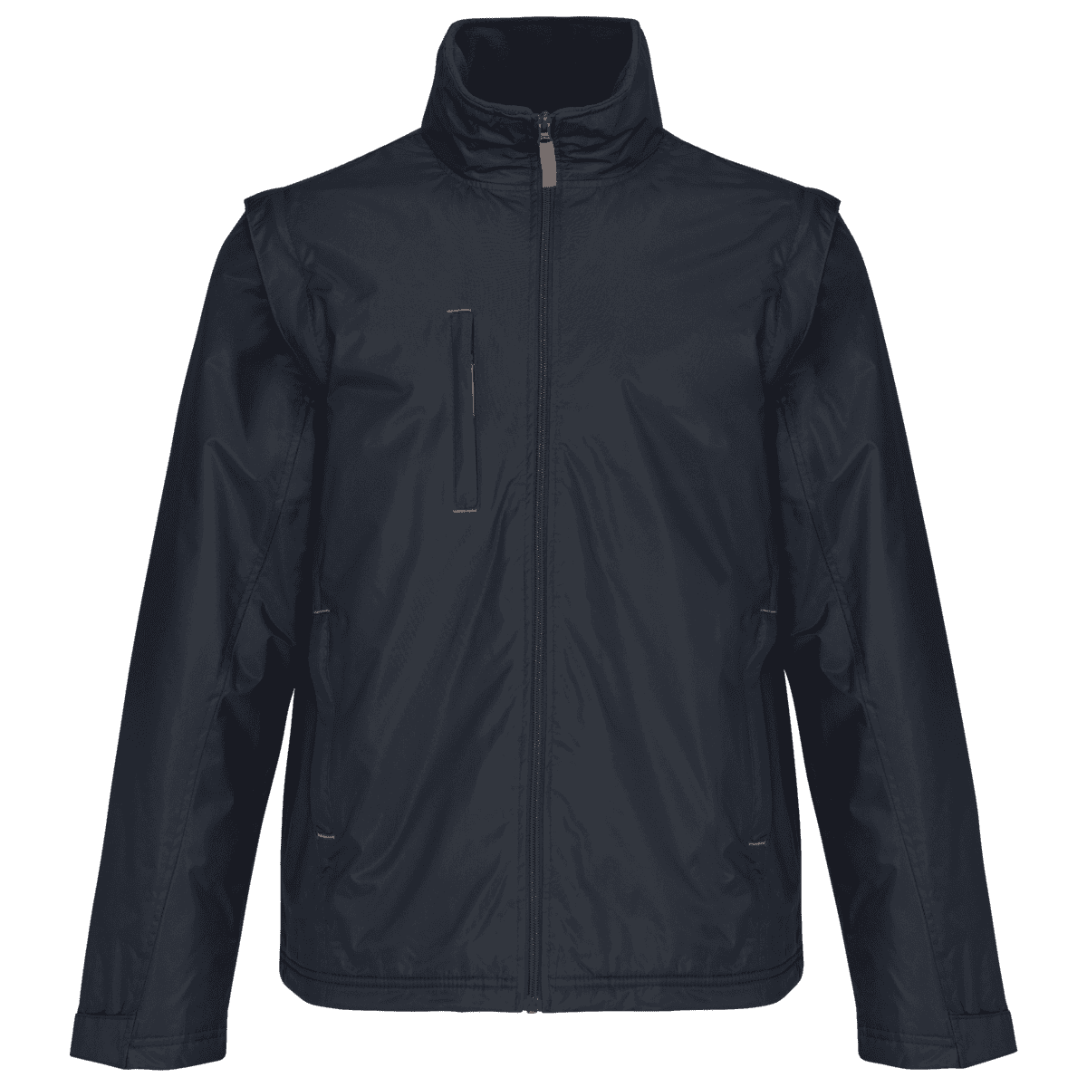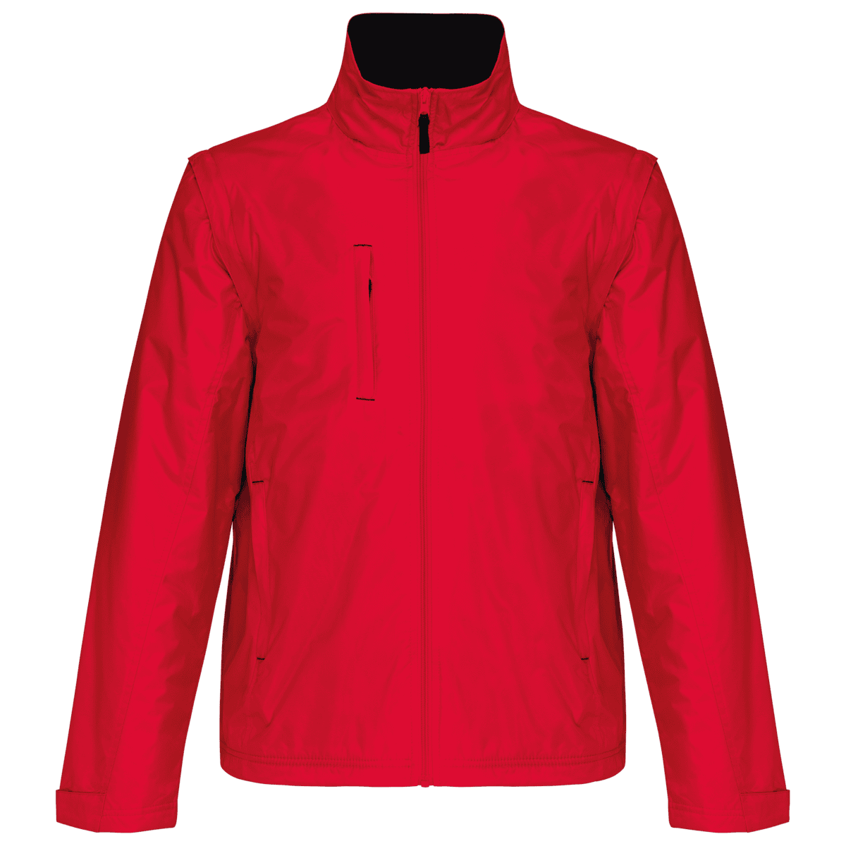 Herenjack met afneembare mouwen – 100% polyester met PVC inductie. 100% polyester fleecevoering. De voering van de mouwen is in 100% polyester + 100% polyesterwatten. Zachte stof. Volledige ritssluiting. 3 zakken met ritssluiting. Afritsbare mouwen. Verstelbare mouwuiteinden. Contrasterende ritstrekker, nektape en stopstiksels. 3 binnenzakken (2 met rits en 1 gsmzakje). Aanrijgkoord aan de binnenkant de jas. Capuchon verwerkt in de kraag. Drukkersrits. – PVC-coating voor een betere waterdichtheid van de stof. – Sterk, soepel en met thermisch geheugen dankzij de fleecevoering van het lichaam. – Veelzijdig en heel functioneel kledingstuk dankzij de uitneembare mouwen.