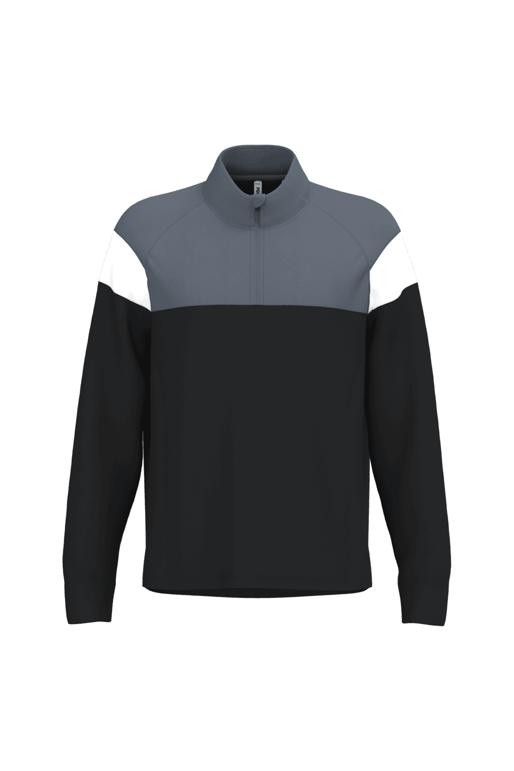 Trainingssweater 1/4 rits uniseks – 100% mat interlockpolyester. Rechte snit. Kraag met een omgekeerde ton-sur-ton nylonrits. Raglanmouwen met contrasterende inzetsels aan de schouder. Contrasterend inzetsel aan schouder en borst. Inzetsels in textuurstof opzij en achteraan. Zoom onderaan en verlengd achterpand. Zijsplitten voor meer gemak. Ritsafdekking boven aan de kraag, voor meer comfort. Afneembaar merklabel voor eenvoudige personalisatie. – Gemakkelijk te onderhouden mat interlock polyester. – Raglanmouwen met contrasterende schouderinzetten. – Opstaande kraag.