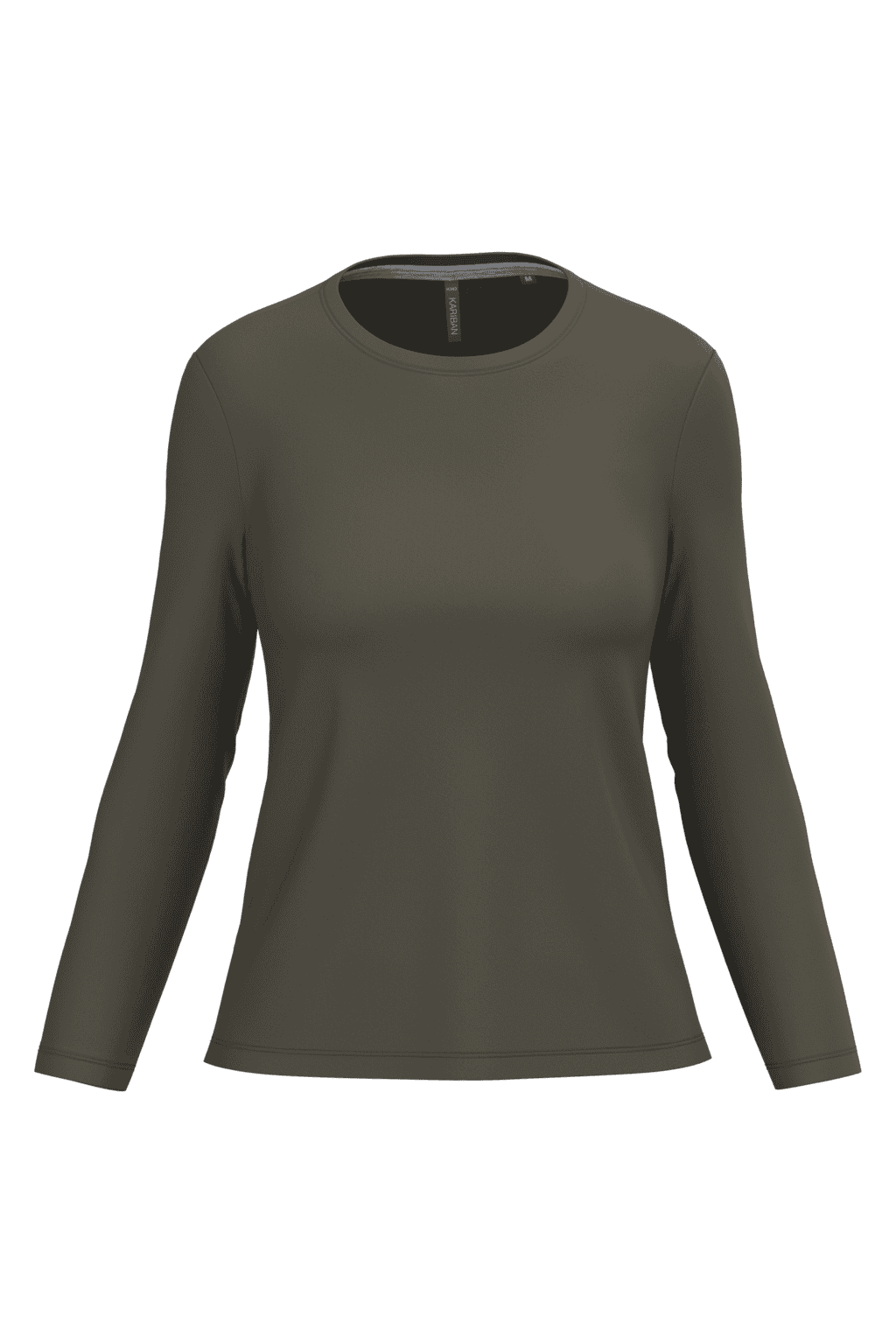 Dames T-shirt ronde hals lange mouwen – Effen kleuren : 100% katoen. Oxford Grey : 90% katoen / 10% viscose. Gekamd enzymbehandeld katoen. Getailleerde snit. Nektape (toon-op-toon voor White, Dark Grey voor Oxford Grey en Oxford Grey voor de overige kleuren). Afwerking met dubbele stiksels. – Zacht en uitstekend bedrukbaar. – Enzymgewassen T-shirt met een modieuze snit. Onmisbaar voor professionals ! – Breed scala aan kleuren.
