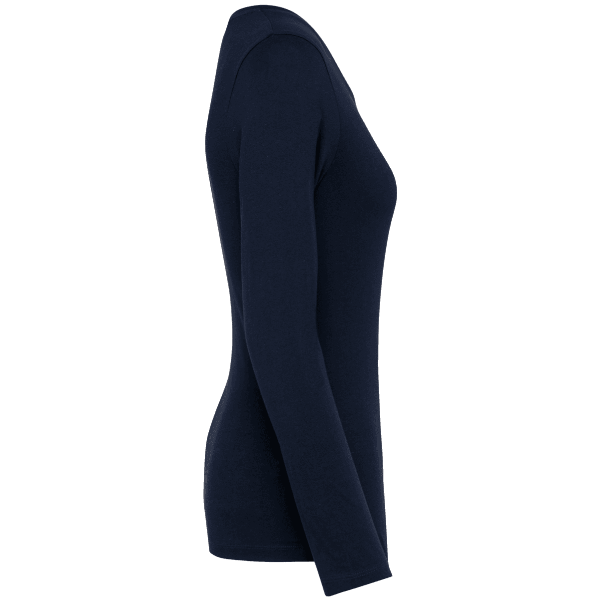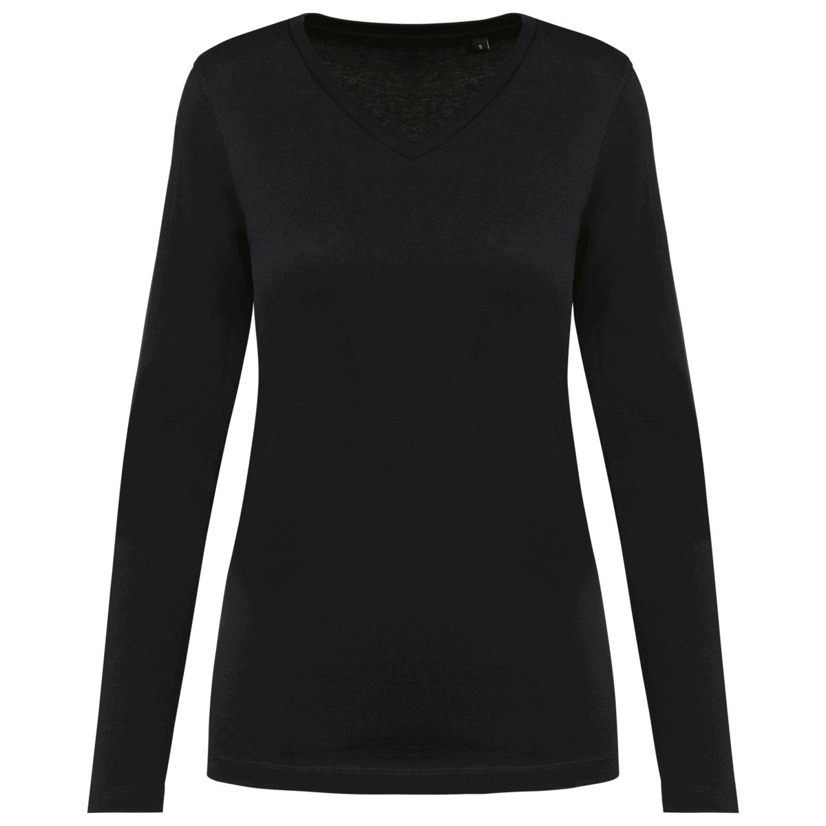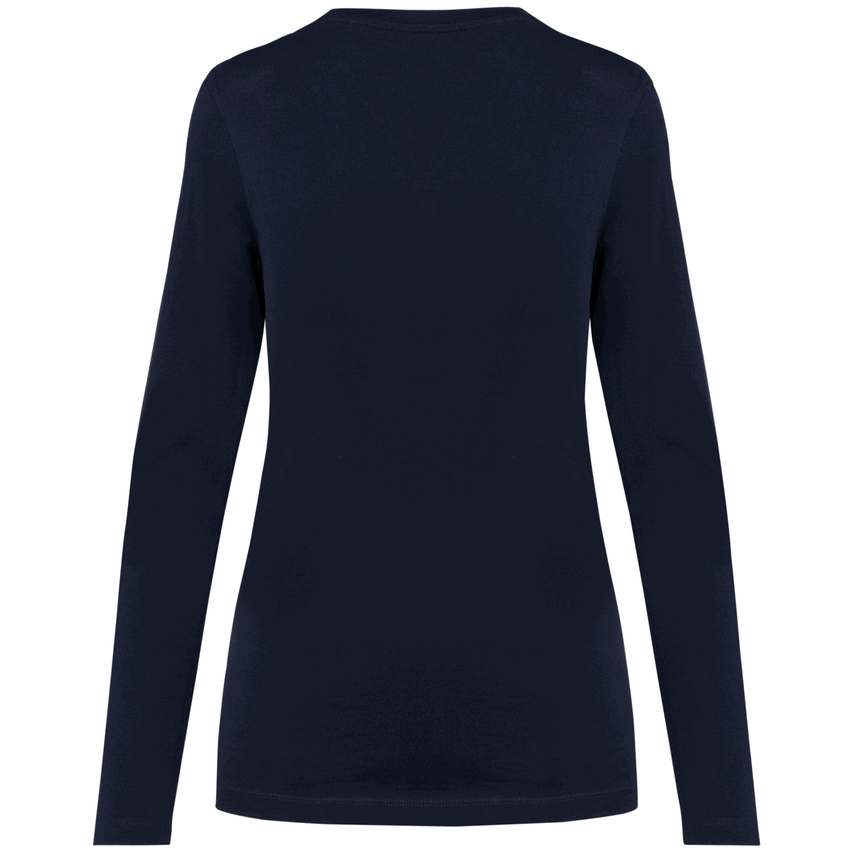 Supima® dames-T-shirt V-hals lange mouwen – 100% katoen. Tricot van gekamd Supima® katoen. Heel fijne, zachte en zijdeachtige jersey van grote kwaliteit. Gesneden en genaaide constructie. V-hals met ton-sur-ton nektape. Versteviging van de schoudernaad met een silicone bandje. De mouwuiteinden en onderkant zijn afgewerkt met een zoompje met dubbel stiksel. Geen merklabel in de kraag, maar enkel een maatlabel voor eenvoudige personalisatie. – Amerikaans Supima® katoen van topkwaliteit. De extra lange vezel zorgt voor stevigheid en zachtheid. – Fitted pasvorm. –