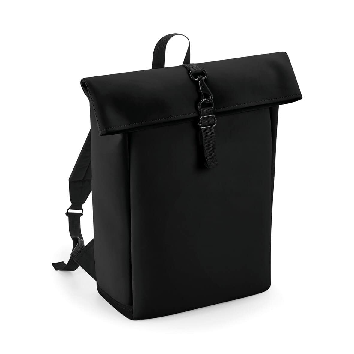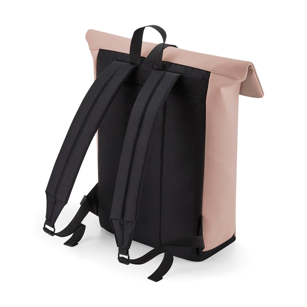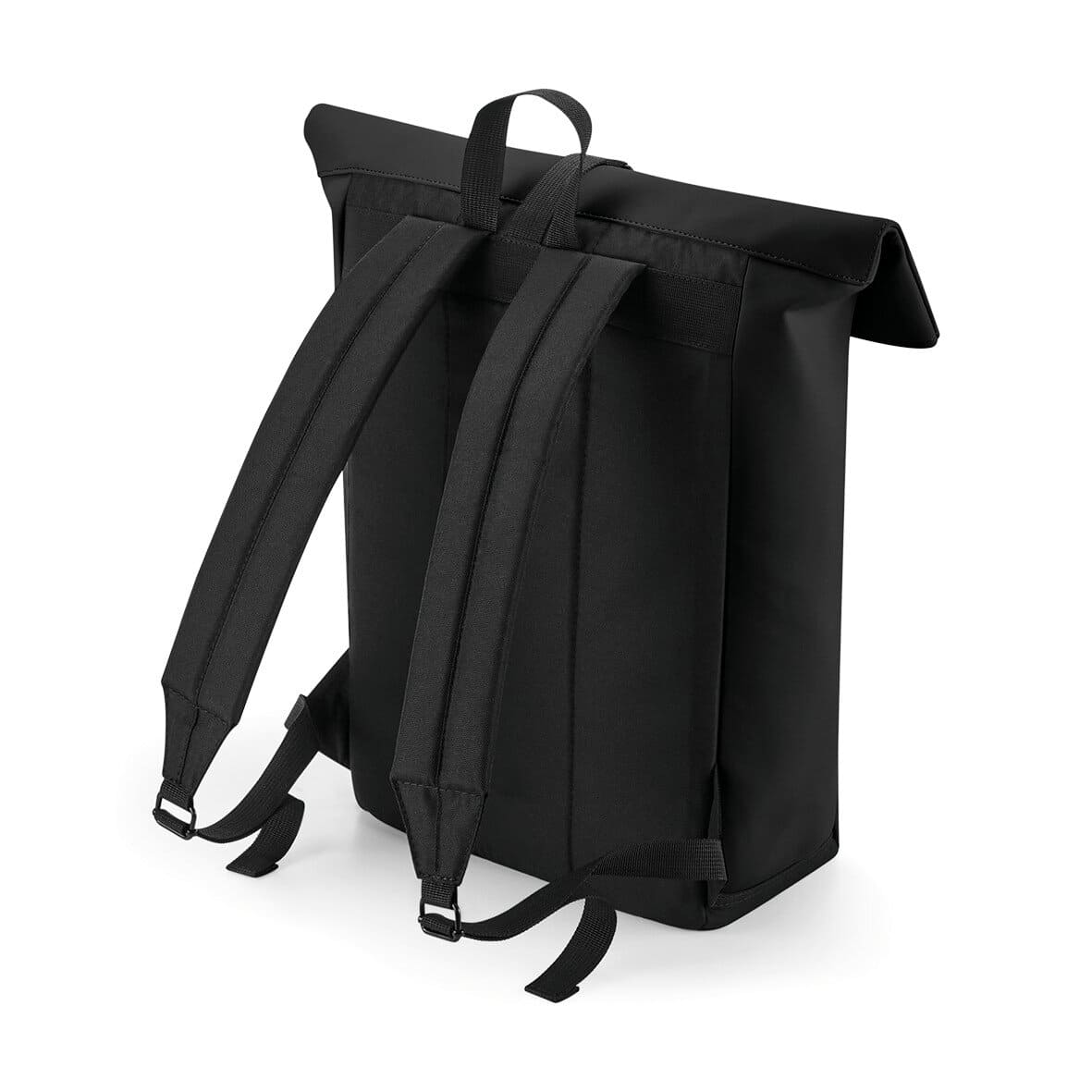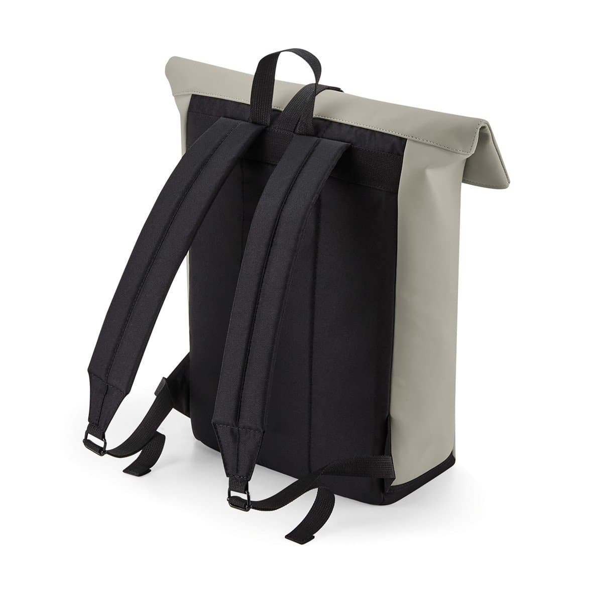 Rugzak met roll-top klep in mat polyurethaan – 100% gerecycled polyester, matte polyurethaancoating zonder pvc. Rugzak in een waterafstotende stof met een gewatteerd laptopvak (maximaal 15,6″). Minimalistische stijl, ritszak vooraan, dubbele bodemvoor meer stevigheid. Sluit met oprollen en een clip. Verstelbare, gewatteerde schouderriemen en handvat. Afneembaar TearAway-etiket dus makkelijk opnieuw te labelen. – Rugzak van gerecycled polyester. – Waterafstotende matte polyurethaan coating. – Gewatteerde laptophoes (maximaal 15,6″).