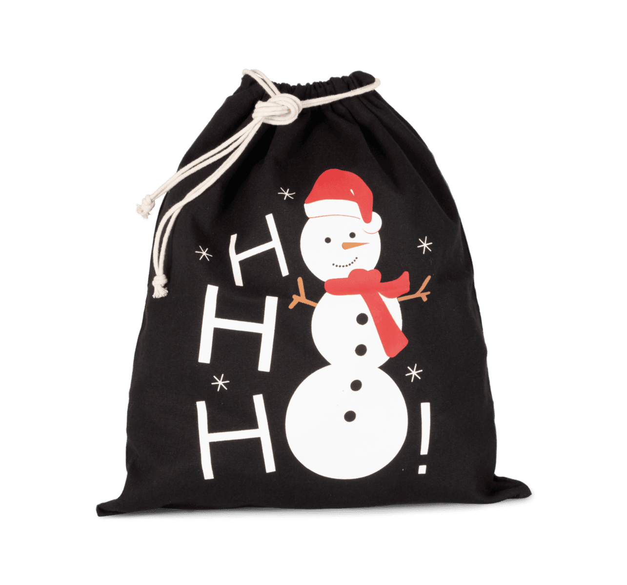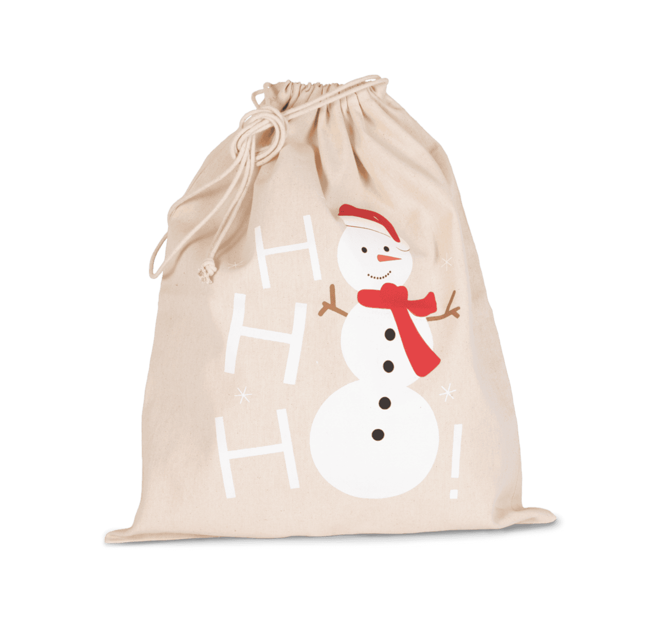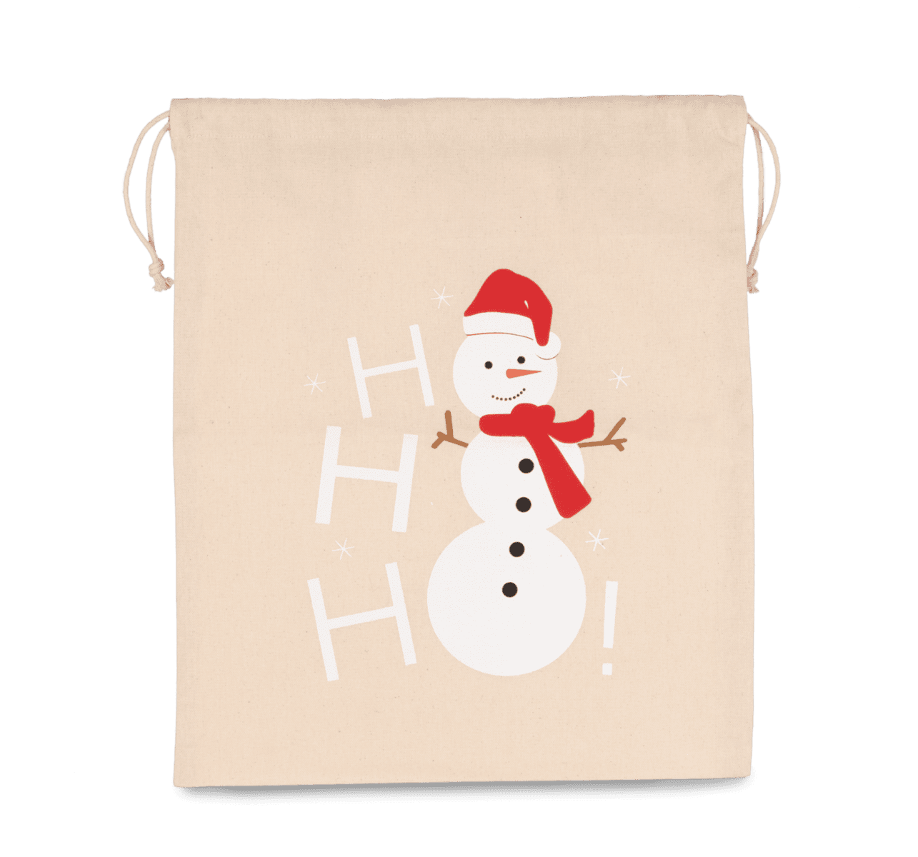 220 g/m² 100% katoen. Katoenen tas met trekkoord en gedrukte sneeuwpop. 38x45cm.