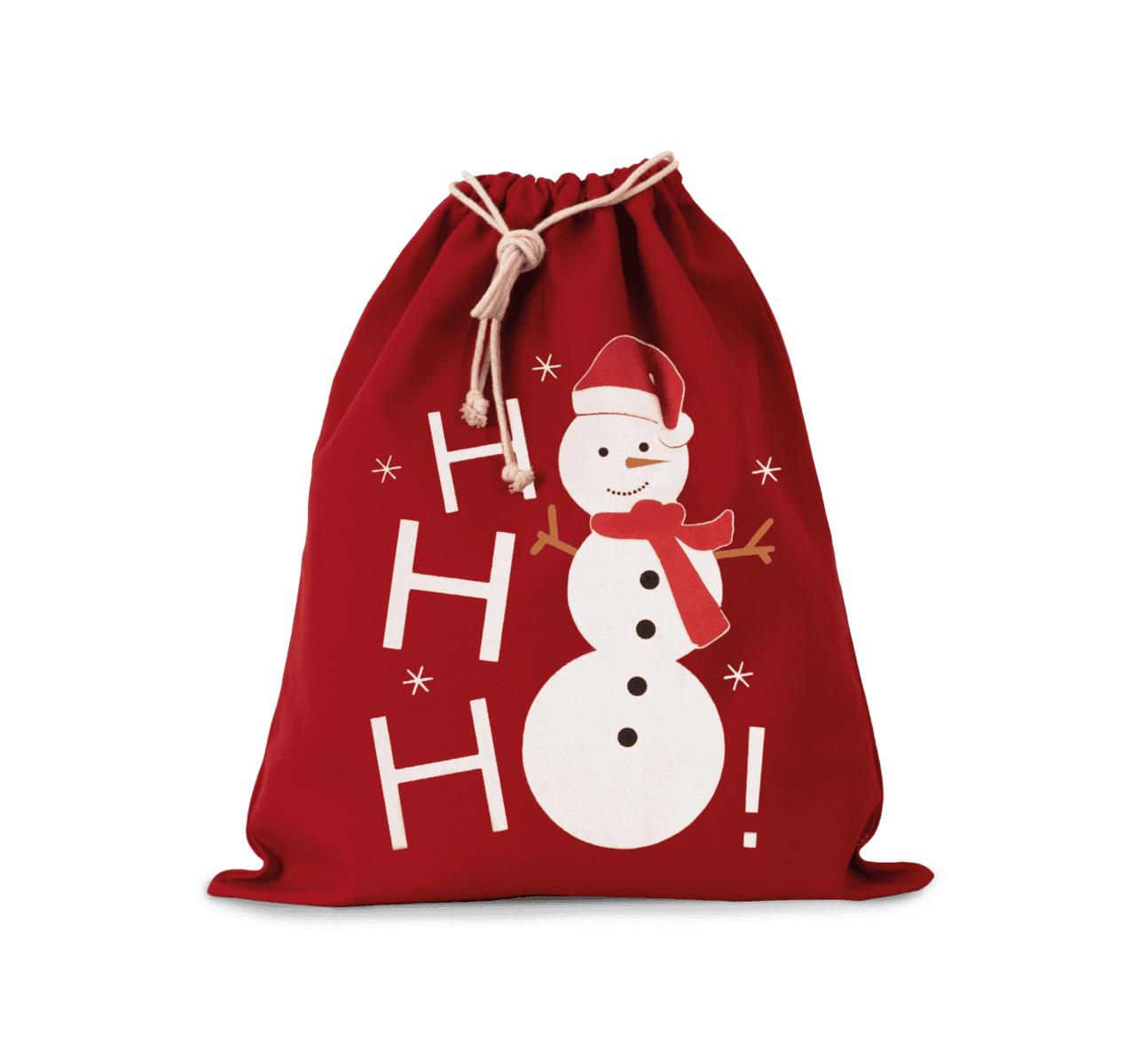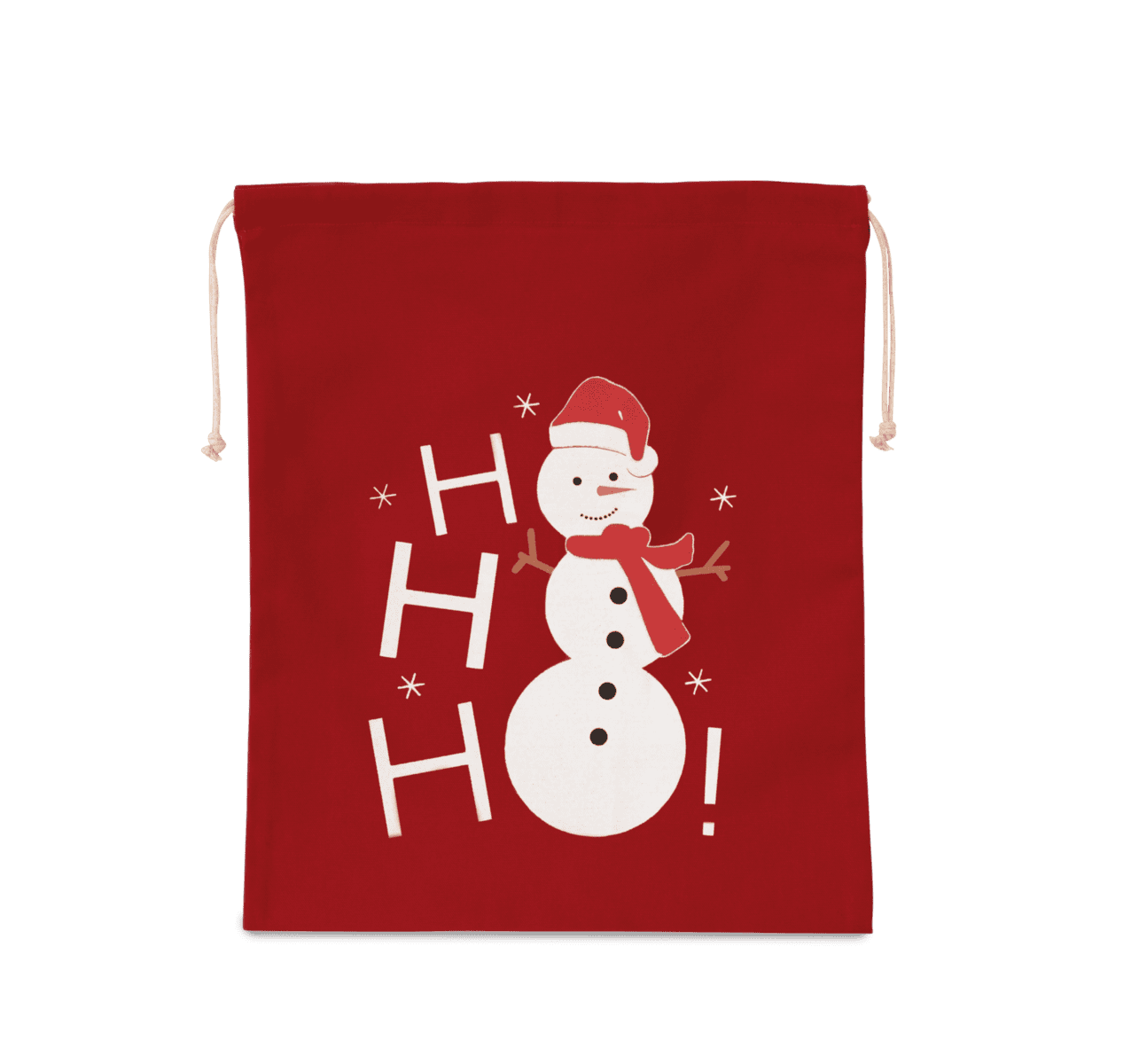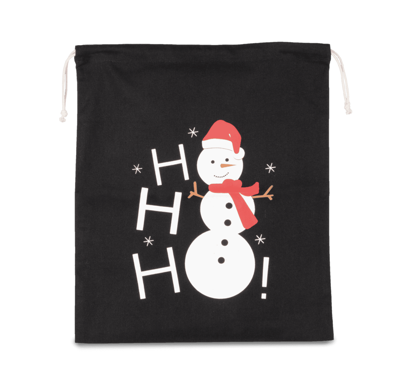 220 g/m² 100% katoen. Katoenen tas met trekkoord en gedrukte sneeuwpop. 38x45cm.